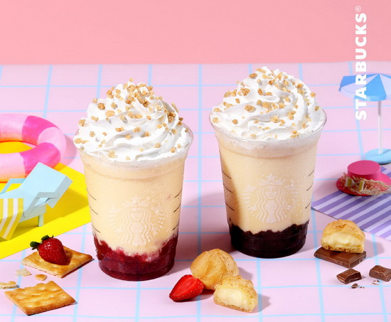 BARU! STARBUCKS® STRAWBERRY CHOUX CREAM FRAPPUCCINO® BLENDED BEVERAGE: Rasakan kenikmatan rasa stroberi dan krim yang lezat dari minuman blended Strawberry Choux Cream Frappuccino® terbaru, yang terinspirasi oleh kue-kue choux Prancis. Whipped cream dan potongan graham cracker crumble saling berlapis di atas campuran lezat dari susu, es, dan saus vanilla bean custard, serta potongan stroberi segar untuk suguhan musim panas yang sempurna. Tersedia sebagai minuman blended.