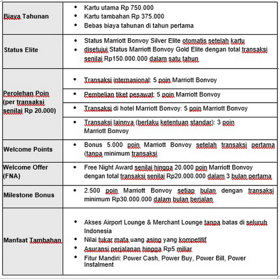 Dirancang bagi nasabah yang ingin memperkaya pengalaman perjalanannya, Kartu Kredit Marriott Bonvoy® Mandiri menghadirkan rangkaian privilese premium. Nasabah yang berhasil mengajukan kartu akan memperoleh 5.000 poin Marriott Bonvoy sebagai welcome bonus serta status Silver Elite secara otomatis. Selain itu, pemegang kartu juga berkesempatan mendapatkan Free Night Award senilai hingga 20.000 poin setelah memenuhi kriteria transaksi yang ditetapkan.