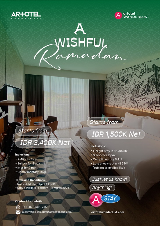 MENYAMBUT bulan suci Ramadan, ARTOTEL Sanur - Bali hadirkan beragam promo menarik, baik untuk menginap maupun F&B dari bulan Februari hingga Maret 2026, dengan tema A Wishful Ramadan.