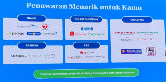 Jenius juga menyiapkan beragam program menarik untuk berbagai kebutuhan, mulai dari belanja kebutuhan sehari-hari, belanja di e-commerce, traveling, hingga hiburan dan lifestyle. Bahkan, bagi pengguna yang menabung mata uang USD di Maxi Saver bisa mendapatkan bunga maksimal 4.2% p.a. dengan pilihan tenor 3 dan 6 bulan. Lalu ada diskon hingga Rp45.000 untuk transaski GoFood dan cashback hingga Rp100.000 berbelanja di supermarket (GrandLucky, Superindo, Ranch Market, Farmers Market, The Gourmet, dan Pasarina) menggunakan Kartu Kredit Jenius .