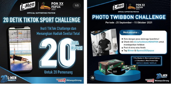 L-Men turut mempromosikan ajang PON XX Papua 2021 melalui berbagai aktivasi digital, misalnya ’20 Detik TikTok Sport Challenge’ dan ‘Photo Twibbon Challenge’, untuk mengajak semakin banyak anak muda di Indonesia untuk ikut menyemarakkan PON XX. Dukungan aktivasi digital dilakukan melalui berbagai aset digital L-Men, melibatkan para Grand Finalist The New L-Men of The Year dan komunitas olahraga di berbagai wilayah di Indonesia. L-Men juga melakukan promosi tentang PON XX Papua 2021 di platform e-commerce rekanan L-Men serta melalui acara press conference hari ini untuk melibatkan rekan-rekan media di seluruh Indonesia dalam mempromosikan ajang PON XX Papua 2021.
