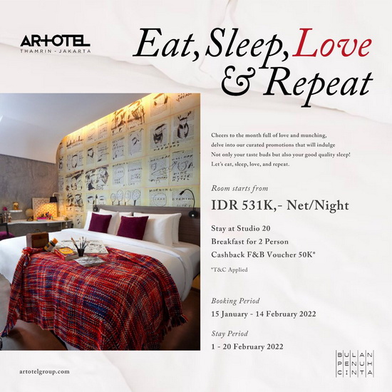 Paket menginap bertajuk Eat, Sleep, Love and Repeat di ARTOTEL Thamrin - Jakarta dapat dinikmati dengan harga Rp. 531.000,-net per malam yang termasuk : sarapan pagi untuk dua orang dan voucher cashback senilai Rp. 50.000 yang dapat dinikmati untuk pembelian makan atau minum dengan minimum transaksi Rp.250.000,-net selama menginap. Penawaran menarik ini ini dapat dipesan melalui website resmi di artotelgroup.com