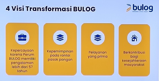 Saat ini BULOG sedang mengadakan transformasi dari hulu ke hilir dengan empat visi yang diusungnya, yaitu :