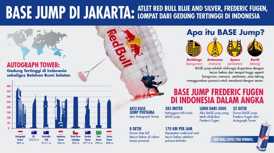 INDONESIA menoreh sejarah baru dalam bidang olahraga menantang di dunia. Frédéric Fugen, atlet binaan Red Bull Blue and Silver, sukses melakukan dua BASE jump berturut-turut dari Autograph Tower di Jakarta, gedung tertinggi di Indonesia sekaligus di belahan bumi selatan dengan ketinggian 385 meter. Aksi ini tidak hanya menjadi pencapaian pribadi bagi Frédéric, tetapi juga menempatkan Jakarta sebagai titik lokasi baru di dunia olahraga menantang.
