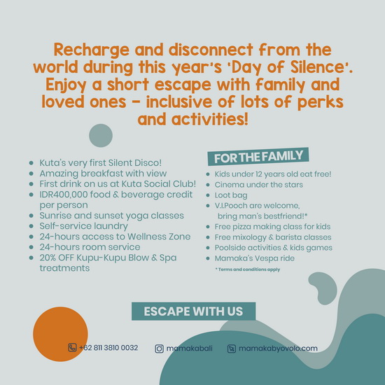 BALI akan segera menyambut Nyepi, memulihkan tenaga dan memutuskan hubungan dari dunia selama Hari Raya Nyepi tahun ini. Nikmati liburan singkat di Mamaka by Ovolo dari tanggal 21 hingga 23 Maret 2023. Temukan pengalaman menginap 3 hari 2 malam dengan banyak keuntungan.