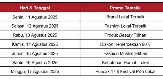 Jangan lewatkan juga deretan promo spesial di kalender tematik kampanye 17.8 Festival Pilih Lokal yang hadir setiap hari dengan penawaran berbeda