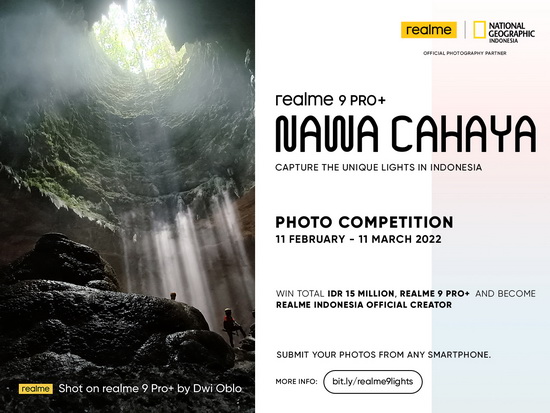 Untuk membuktikan ketangguhan dan kehandalan kamera flagship realme 9 Pro+, realme bekerjasama dengan National Geographic Indonesia mengeksplorasi sembilan cahaya unik yang tersebar di Indonesia melalui program Nawa Cahaya: Capture The Unique Lights di Indonesia bersama delapan fotografer profesional dari National Geographic Indonesia menggunakan realme 9 Pro+. realme bersama National Geographic Indonesia juga menggelar kompetisi foto bertajuk “Nawa Cahaya: Capture The Light Photo Competition” dengan total hadiah Rp 15 juta, realme 9 Pro Series dan kesempatan untuk menjadi realme Indonesia Official Creator. Kompetisi foto bertema foto low-light dan landscape yang diambil melalui kamera smartphone ini akan berakhir pada 11 Maret 2022 untuk pengumpulan foto. Informasi lebih lanjut mengenai kontes foto yang dibuka untuk umum ini dapat dilihat di tautan bit.ly/realme9lights.