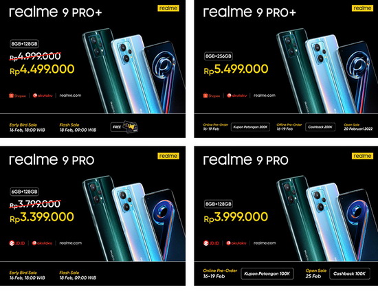 Dalam peluncuran realme 9 Pro Series kali ini, realme bekerjasama secara eksklusif dengan Shopee, JD.ID dan Official Offline Partner, Erafone untuk memfasilitasi anak muda di seluruh Indonesia dalam mendapatkan flagship in mid-range. realme 9 Pro+ yang hadir dengan dua varian warna: Sunrise Blue dan Aurora Green akan secara eksklusif dijual perdana di Shopee melalui program early bird sale hari ini, tanggal 16 Februari 2022 jam 18:00 WIB secara eksklusif di Shopee, akulaku dan realme.com dengan harga Rp 4,499,000 untuk varian 8GB/128GB. Untuk varian 8GB/256GB, realme 9 Pro+ membuka layanan pre-order secara online dan offline mulai tanggal 16 hingga 19 Februari 2022 seharga Rp 5,499,000 dengan tawaran cashback senilai Rp 200,000 di partner exclusive e-commerce dan realme Official Stores offline di seluruh Indonesia.