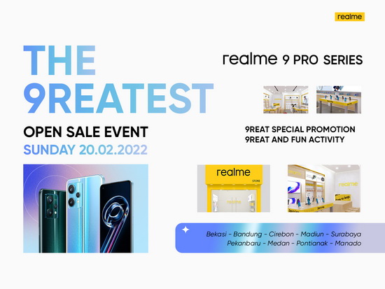 Selain 9 Program Spesial, realme Indonesia juga menyiapkan perhelatan di sembilan kota seluruh Indonesia dalam rangka penjualan perdana offline smartphone flagship in mid-range realme 9 Pro Series. Kesembilan kota yang akan berpartisipasi adalah Bekasi, Bandung, Cirebon, Madiun, Surabaya, Pekanbaru, Medan, Pontianak dan Manado. Acara ini akan menampilkan 9reat special promotion dan 9reat fun activity pada hari Minggu, 20 Februari 2022. Nantikan info selanjutnya mengenai acara ini di akun sosial media resmi realme Indonesia.