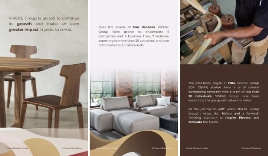Selama empat puluh tahun terakhir, VIVERE Group telah berkembang dan mendapatkan pengakuan dalam bidang interior contracting, jasa mechanical-electrical, furniture manufacture and component, perabot kantor, serta perabot dan perlengkapan rumah tangga. Kini VIVERE Group telah memiliki lebih dari 1.500 karyawan.