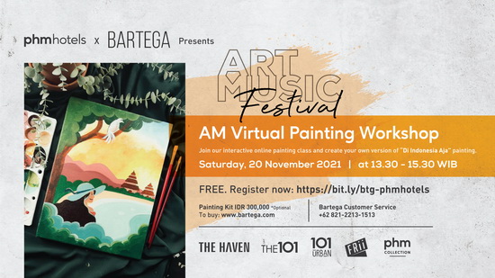 PHMHOTELS menghadirkan AM Virtual Painting Workshop, kelas melukis interaktif online, bekerja sama dengan BARTEGA Studio pada hari Sabtu, 20 November 2021 pukul 13:30 – 15:30 WIB. Acara AM Virtual Painting Workshop terbuka secara gratis bagi siapa saja melalui online streaming platform. Mengusung tema “Di Indonesia Aja,” workshop ini bertujuan untuk mengingatkan kembali akan keindahan destinasi wisata di Indonesia. AM Virtual Painting Workshop memberikan kesempatan bagi masyarakat untuk dapat mengekspresikan diri melalui kanvas.