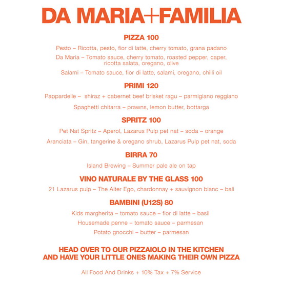 Pilihan pizza dan pasta khas Da Maria akan tersedia mulai dari Rp 100,000, bir Island Brewing on tap seharga Rp 70,000, dan anggur alami Indonesia - Lazarus Pulp per gelas seharga Rp 100,000. Da Maria Pet Nat klasik dan Aranciata Spritz dalam paket ini dibanderol dengan harga juga Rp100,000.