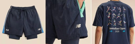 Pada bawahan pria, New Balance menghadirkan Australian Open Achieve Short dengan desain 2-in-1. Bagian luar menggunakan premium crinkle nylon dengan teknologi WATER DEFY yang water-resistant, sementara inner fitted berbahan recycled polyester dan spandex memberikan efek kompresi untuk menopang otot saat bergerak aktif di lapangan.