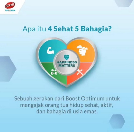 Adapun Gerakan 4 Sehat 5 Bahagia yang direkomendasikan Nestlé BOOST Optimum untuk dijalankan oleh para lansia dalam kehidupan sehari-harinya adalah sebagai berikut: